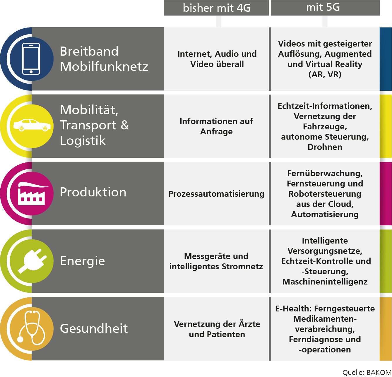 Die Infografik zeigt, welche zusätzlichen Nutzungsmöglichkeiten mit dem Übergang von 4G zu 5G entstehen.
